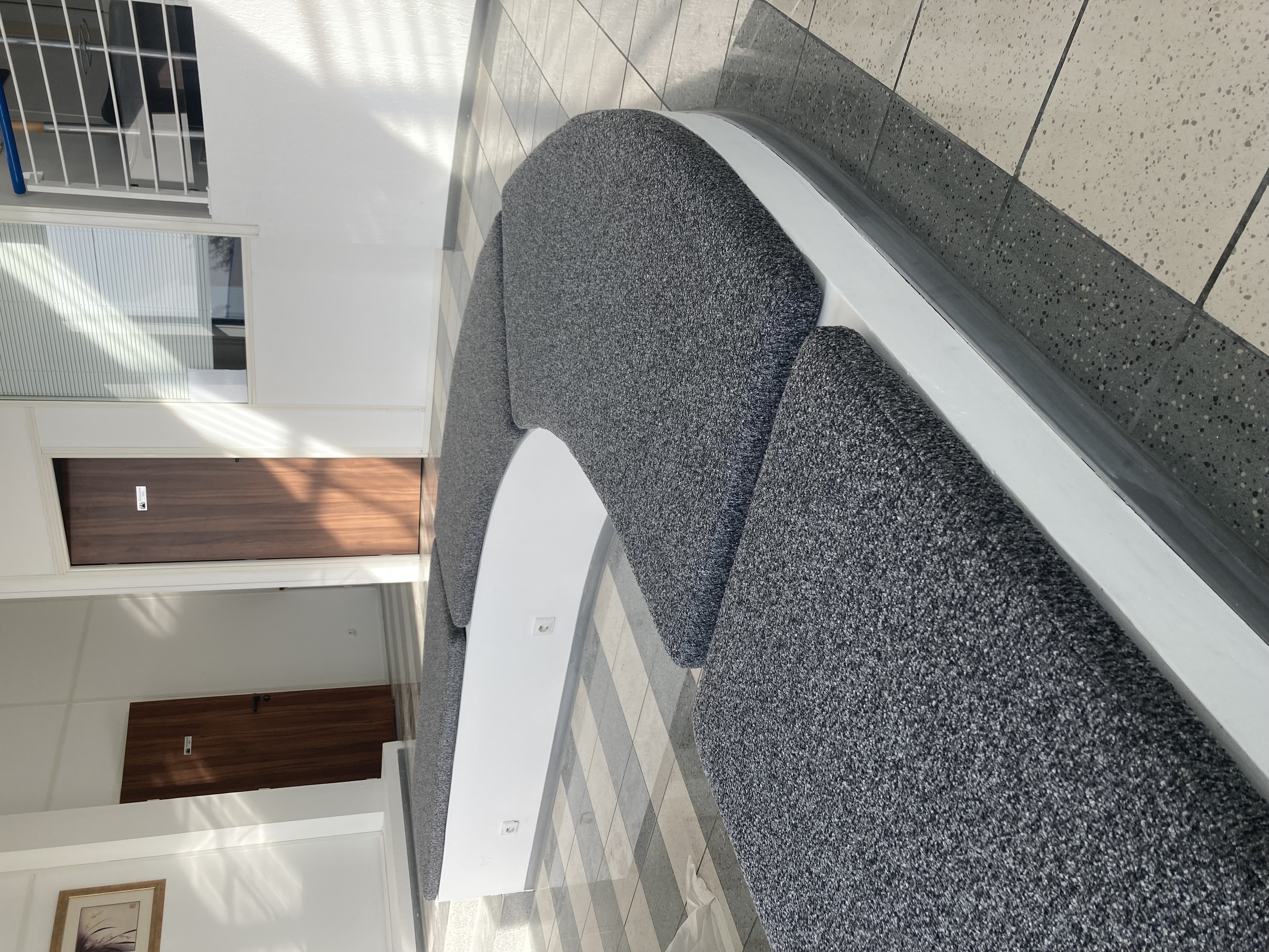Grande banquette arrondie réalisée en tissu texturé technique. Assise confortable et dossier mural coordonné.
