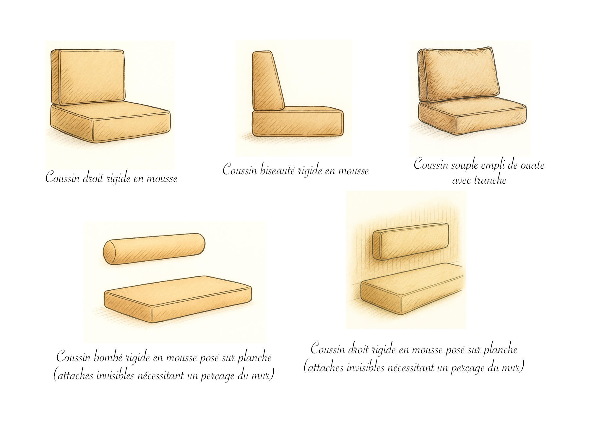 - épaisseur souhaitée (calculez-la en mesurant la banquette depuis le sol : l'ensemble banquette + coussin doit être compris entre 45 et 50 cm pour un espace détente et entre 47 et 51 cm pour un espace repas)