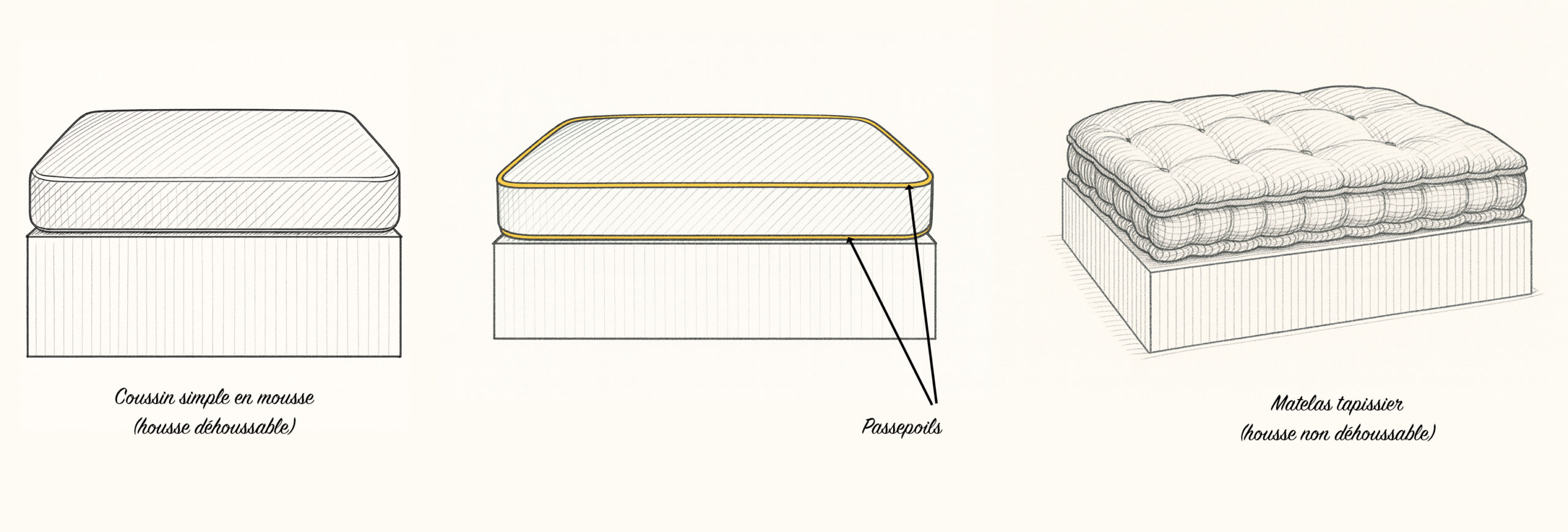 Coussin simple : plaque de mousse recouverte de tissu, housse déhoussable.