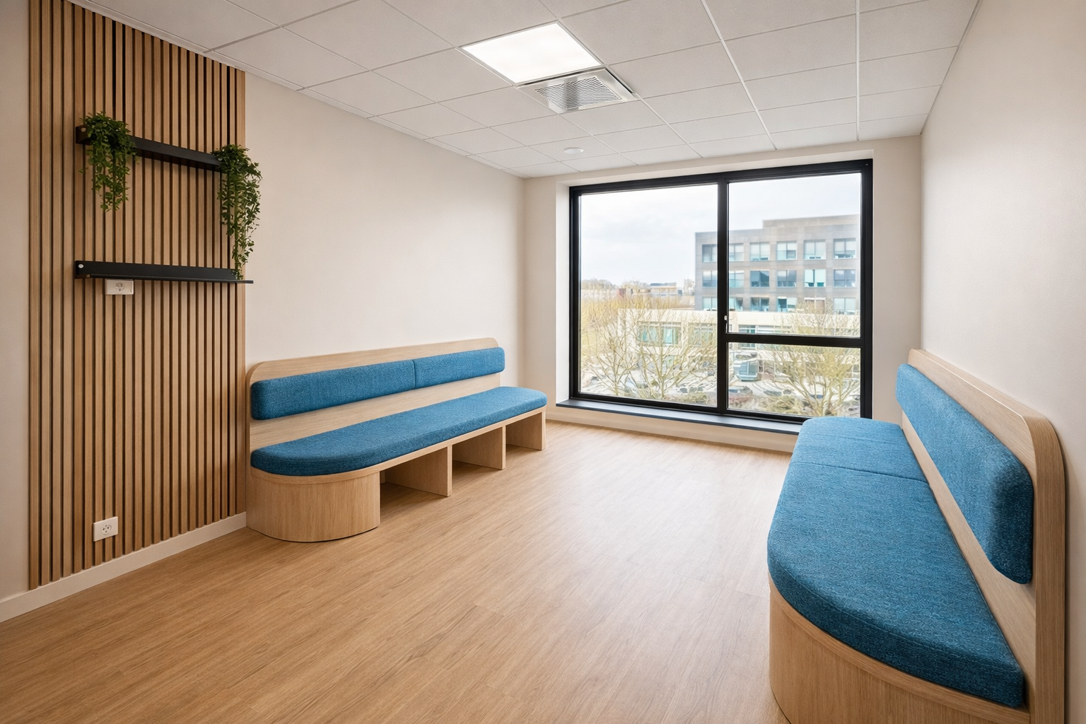 3- Ensemble de coussins de banquette sur mesure pour la salle d’attente d’un cabinet médical : Angles arrondis, choix d’un tissu avec respect de la charte graphique, des obligations et normes techniques non feu, choix d’une densité pour assurer la durabilité des banquettes, dossiers suspendus fixés aux banquettes bois.