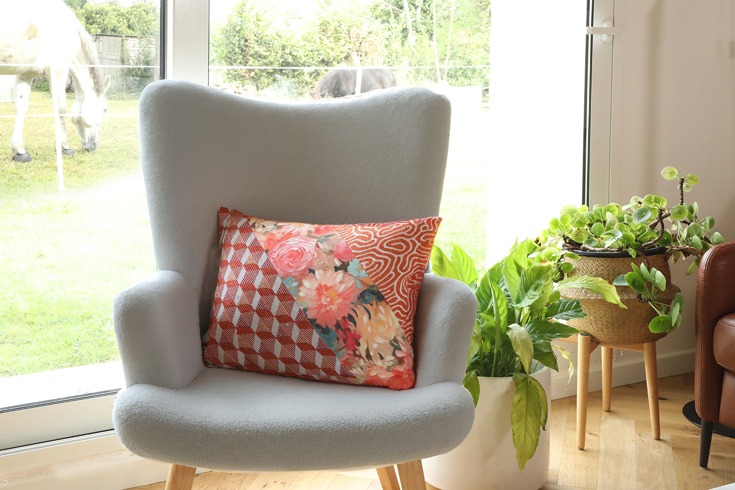 Le coussin terracotta réchauffe instantanément un canapé clair, un fauteuil gris ou une banquette taupe.
